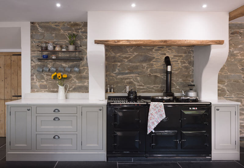 The cast-iron Aga cooker set against exposed stone creates a real show-stopping look, while the open-plan layout provides plenty of space but retains a homely and traditional feel.